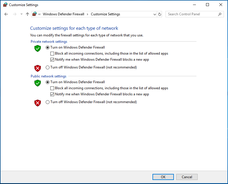 Just go to Control Panel , click Windows Defender Firewall > Turn Windows Defender Firewall on or off and ensure the Firewall is enabled.
