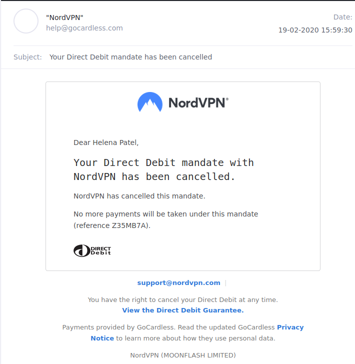 Please check the details above - if they are incorrect or there are any other issues with this Direct Debit, please contact NordVPN (MOONFLASH LIMITED) at support@nordvpn.com.