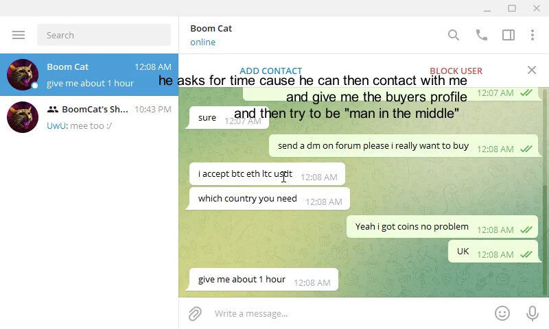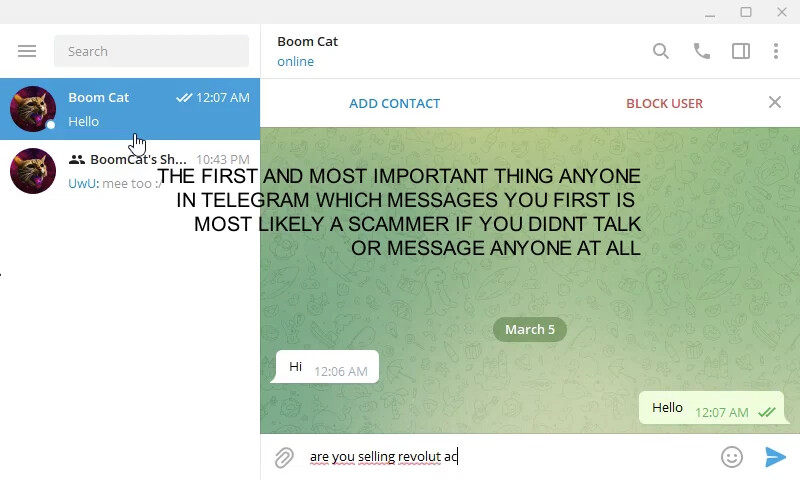 When you click on a profile if you are not being careful enough you might think this is the right person that you are talking but if you look it careful @BoomCat is not his “username” it’s his “bio” bio is like a status message for telegram but you can put “@” there so if you don’t look carefully you might miss that