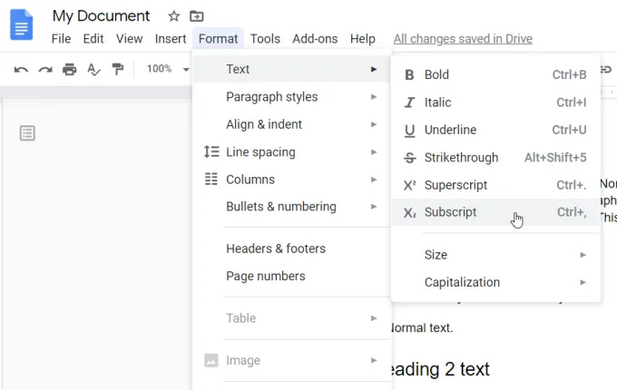 Creating subscript formatting in Google Docs is almost identical to creating superscript formatting. You can create subscript text in Google Doc using the menu system.