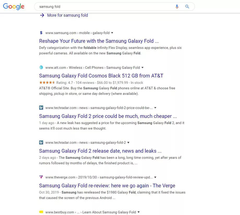 In my Chrome desktop browser, it feels like an aggravating, unnecessary change that doesn’t actually help the user determine how good, bad, or reputable an actual search result might be. Yes, ads are still clearly marked with the word “ad,” which is a good thing. But do I need to see Best Buy’s logo or AT&T’s blue circle when I search for “Samsung Fold” to know they’re trying to sell me something?