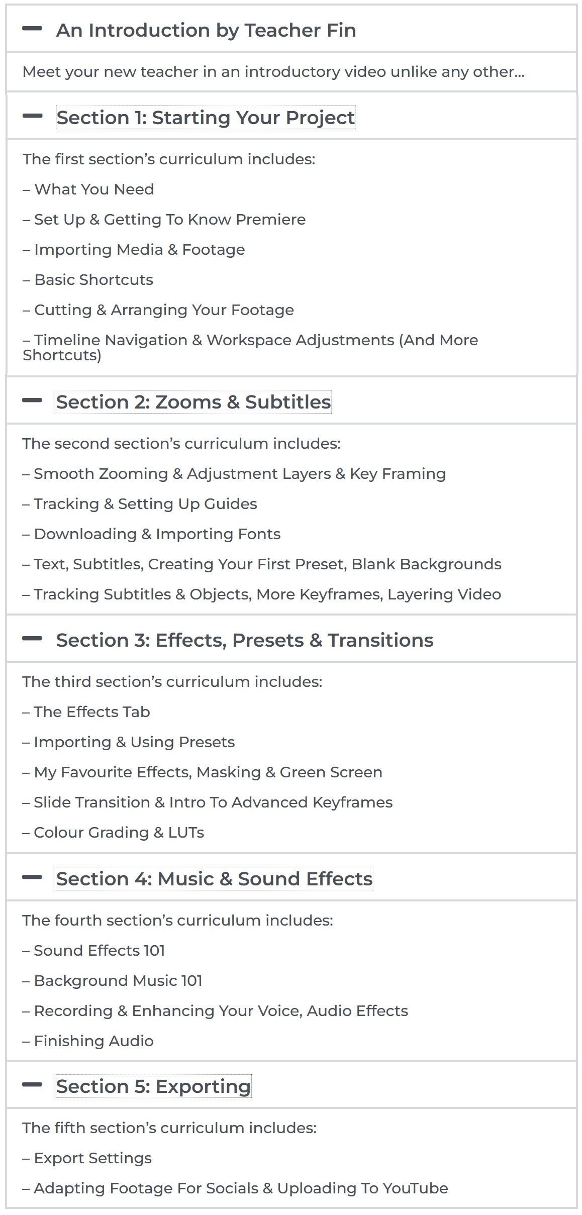 I have made an Adobe Premiere Pro course unlike any other – one that will take you from being a no-belt to a black belt in video martial arts! Across dozens of easily digestible lessons, I will show you how to edit in Premiere Pro the Finzar way.
