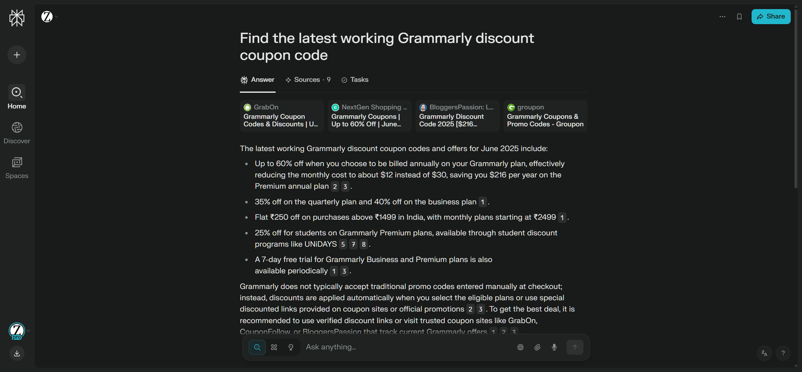 - Perplexity will often list multiple coupon codes. Some may work, others might not.